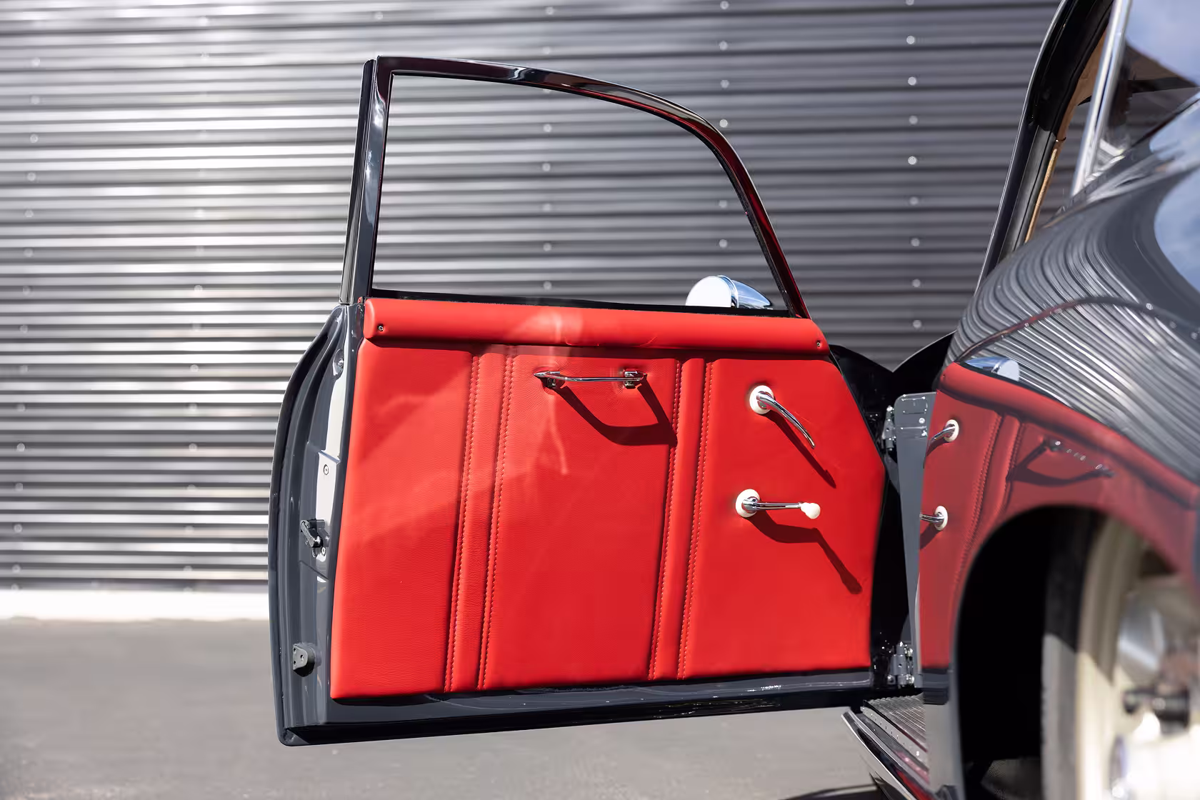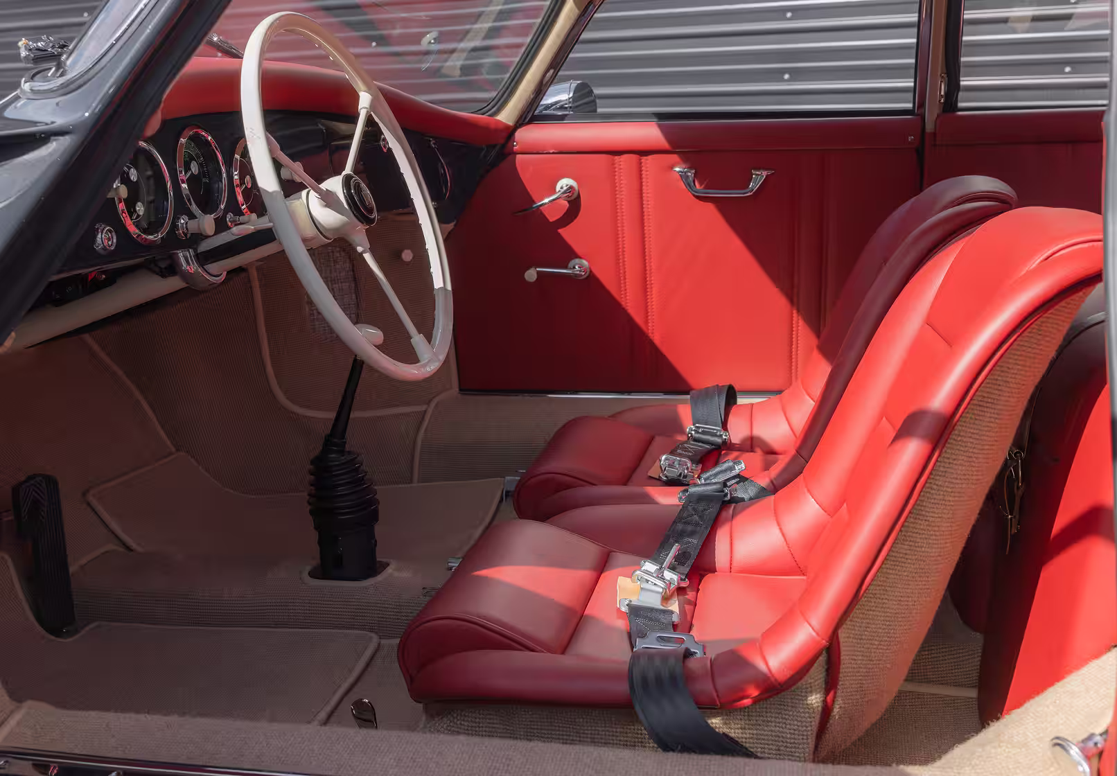 By JS Custom Interiors, featuring Impact “Rosso Scuro Red” Leather and Impact Tan Leather. With German Square Weave carpet. Seats are from a Porsche Speedster. Koch’s Shrunken Porsche Steering Wheel, stock column. Custom-built Dakota Digital Gauges.