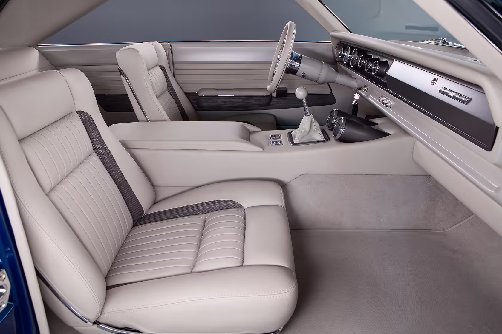 By JS Custom Interiors Full leather interior color is called “Dolphin” with stock modified seats and deleted rear seats. Dash is completely 3D Printed by Stratasys, designed in house. Custom one-off Dakota Digital Gauges. Steering wheels is Billet Specialties Formula “D” 14” double wrapped in leather.