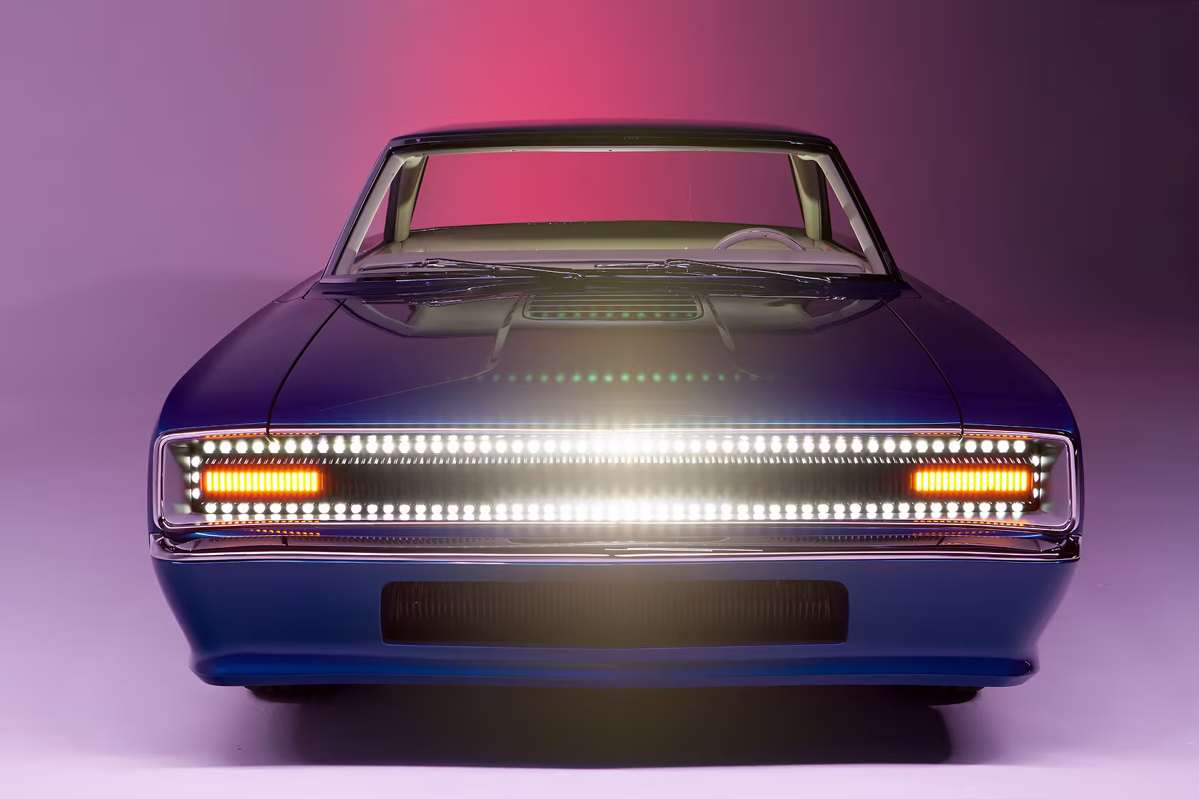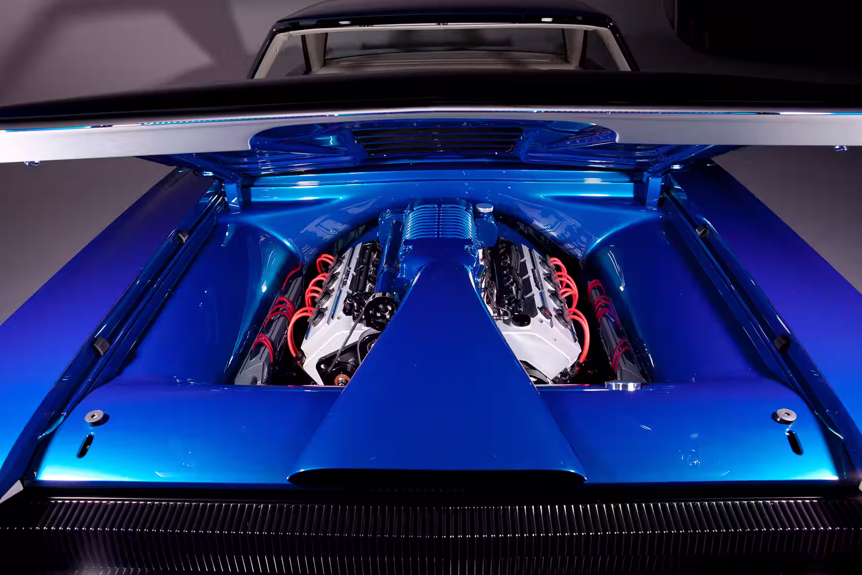 Custom lower valance, silvered bumper, LED surround headlamps, and sequential LED markers, framed by bespoke grille trim and Corvette hood latches. The body is chopped 1½ inches up front with a laid-back windshield, one-piece glass, and custom 3D-printed trim. Stretched rear wheel openings, triple-plated chrome roof rail trim, and a fabricated rear roll pan give it a menacing stance, while EVOD CNC-machined taillight grilles conceal a full-width LED with sequential signals. Sitting on an Art Morrison chassis with custom floors, tubs, and belly pans, the smoothed, emblem-free bodywork flows into flush-mounted details like the custom gas cap. Thousands of hours went into the sculpted engine bay, matte-finished interior, and one-touch Zoomie exhaust cutouts—making this ride as refined as it is aggressive.