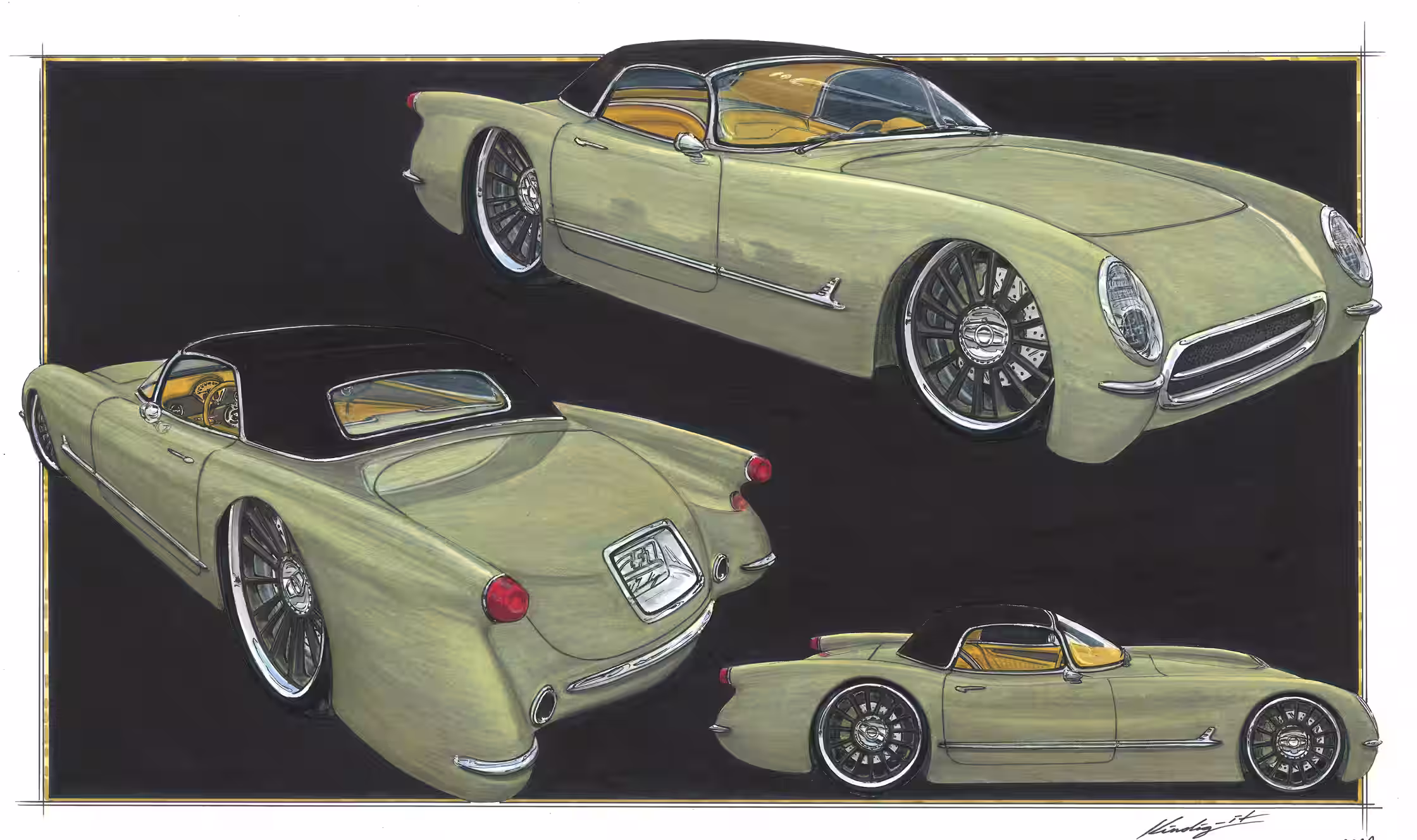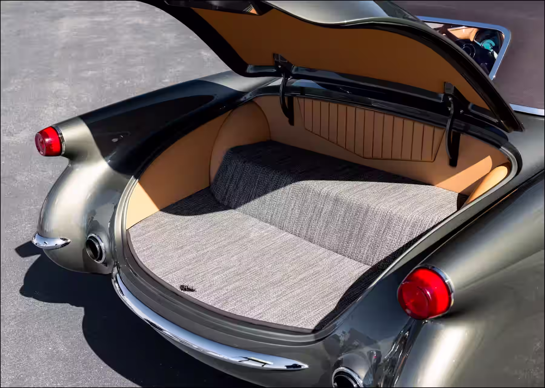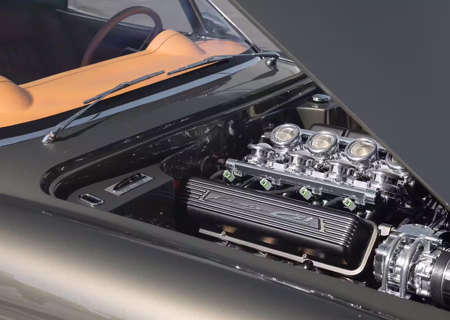 Body is full Carbon Fiber produced by Doug’s Performance Corvettes, tubbed, 3 inch to zero wedge sectioning. Stretched Door 4.5”, Stock Wheel Base, Reshaped wheel arches to hug the wheels, 2.5” Chopped & Laid Back Windshield frame, Shaved Cowl Vent, Shaved Tonneau Cover. The cabriolet has a different windshield and a removed Carson style top.