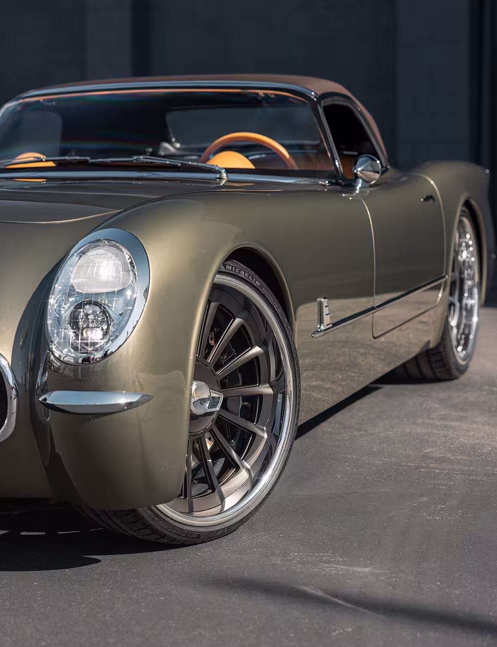 Wheels are one-off designed by Dave Kindig and built by EVOD with a 2 tone finish. Front 21x9 and Rear 22x12. Tires are Michelin Pilot 4S Front 255/30/21 and Rear 335/25/22.