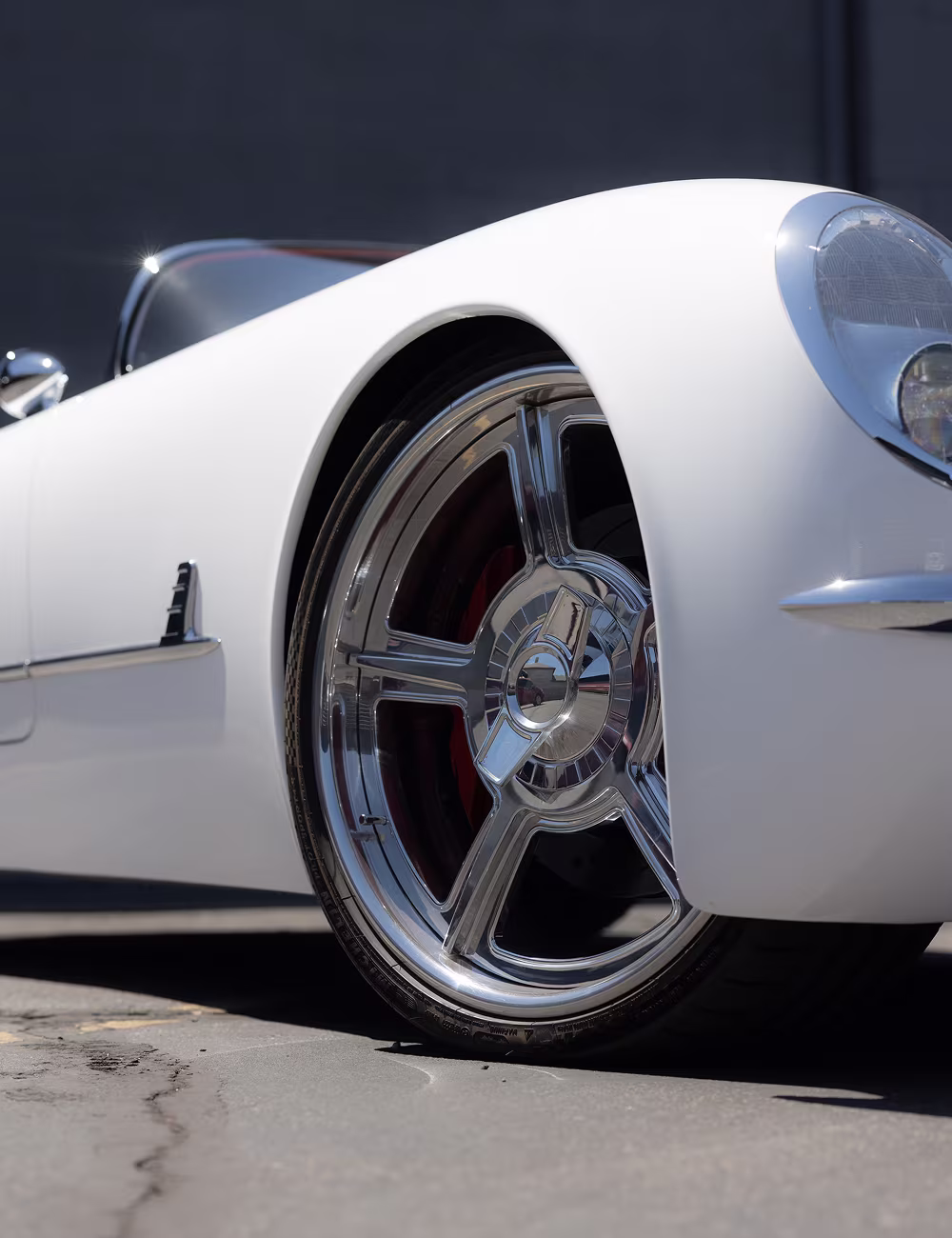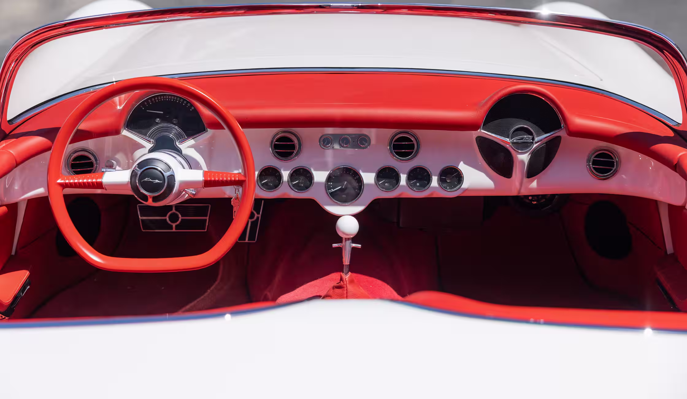CF1 #001 was inspired by the very first Corvette in 1953, and we chose to do the original color combo of White exterior and Red Interior.