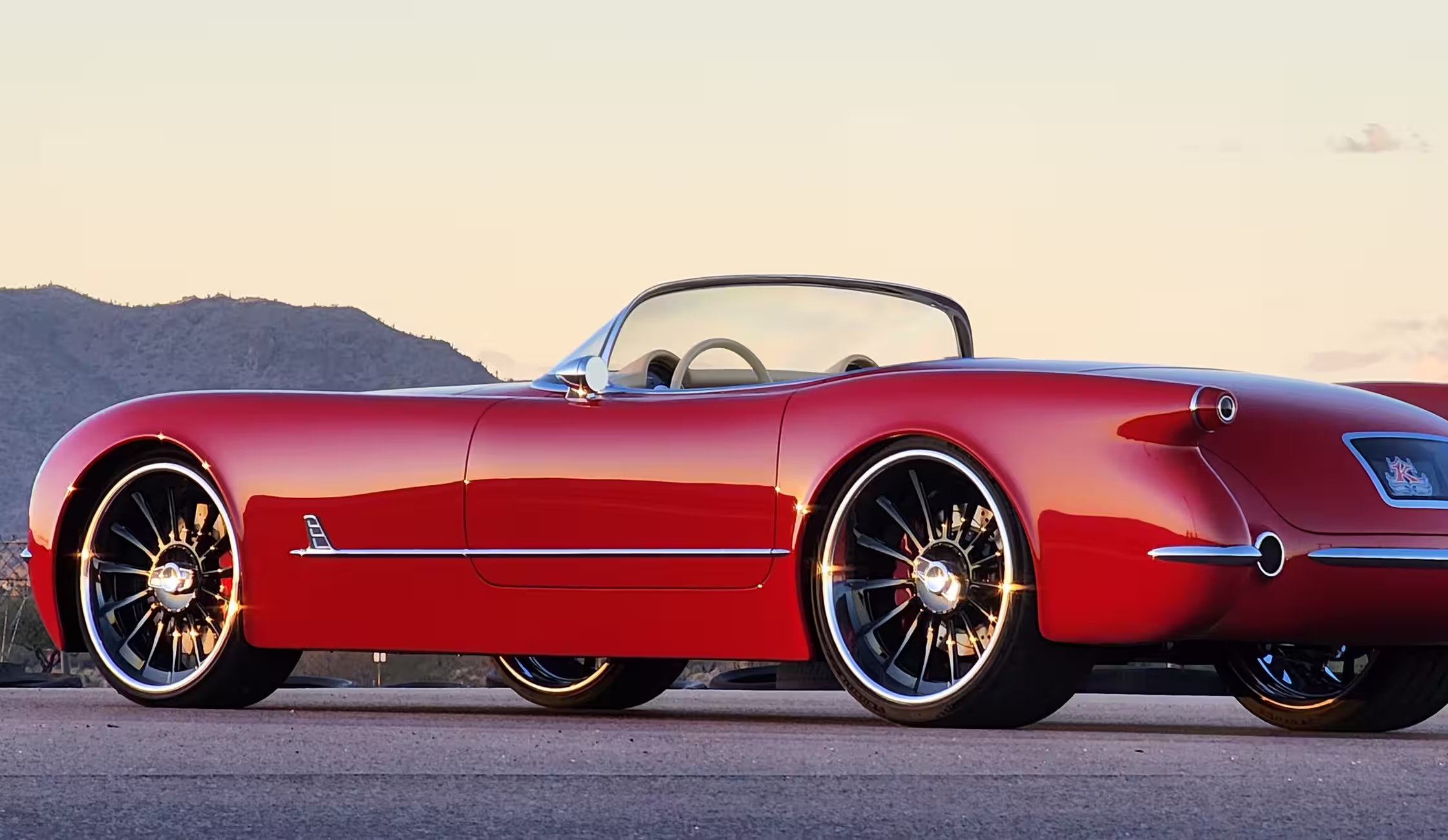 Wheels are one-off with a modern turbine styling designed by Dave Kindig and built by EVOD. Front 21x9 and Rear 22x12. Tires are Michelin Pilot 4S Front 255/30/21 and Rear 335/25/22.