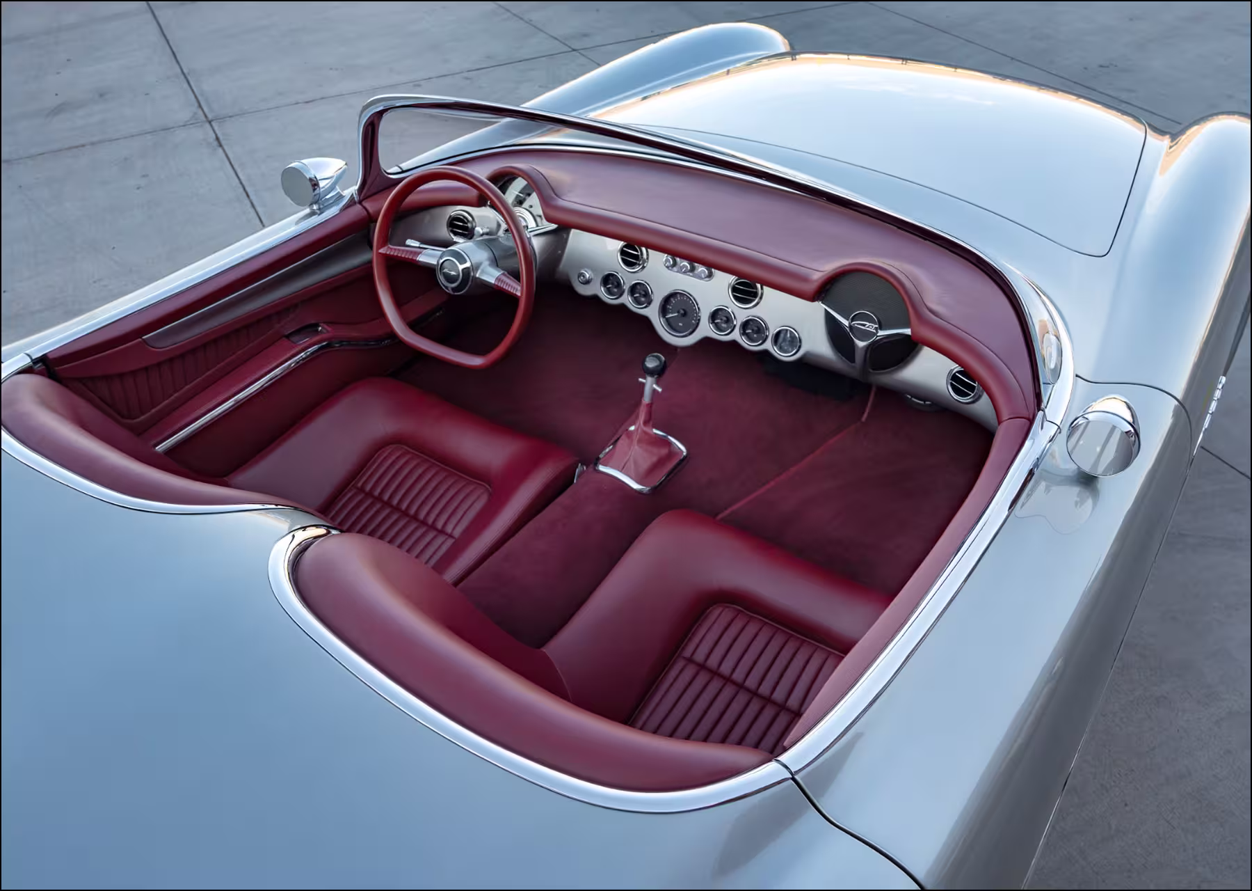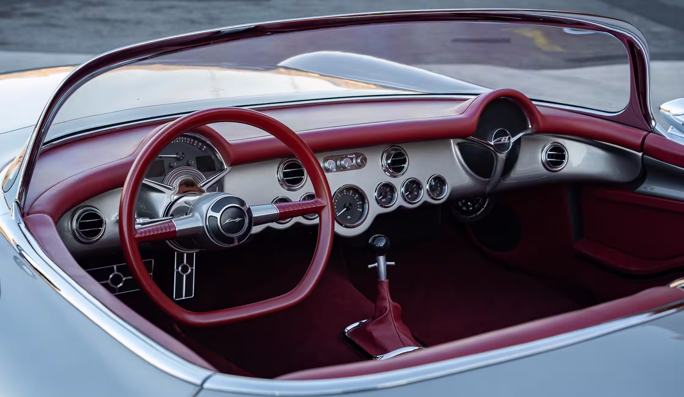 Leather interior in Color “Auburn Red” by JS Custom Interiors. Custom Door Panels Wrapped in leather. 3D Printed Glove Box. Full custom built seats. Sparc Industries Steering Wheel Designed by Dave built by Sparc. Dakota Digital Custom Built & Designed