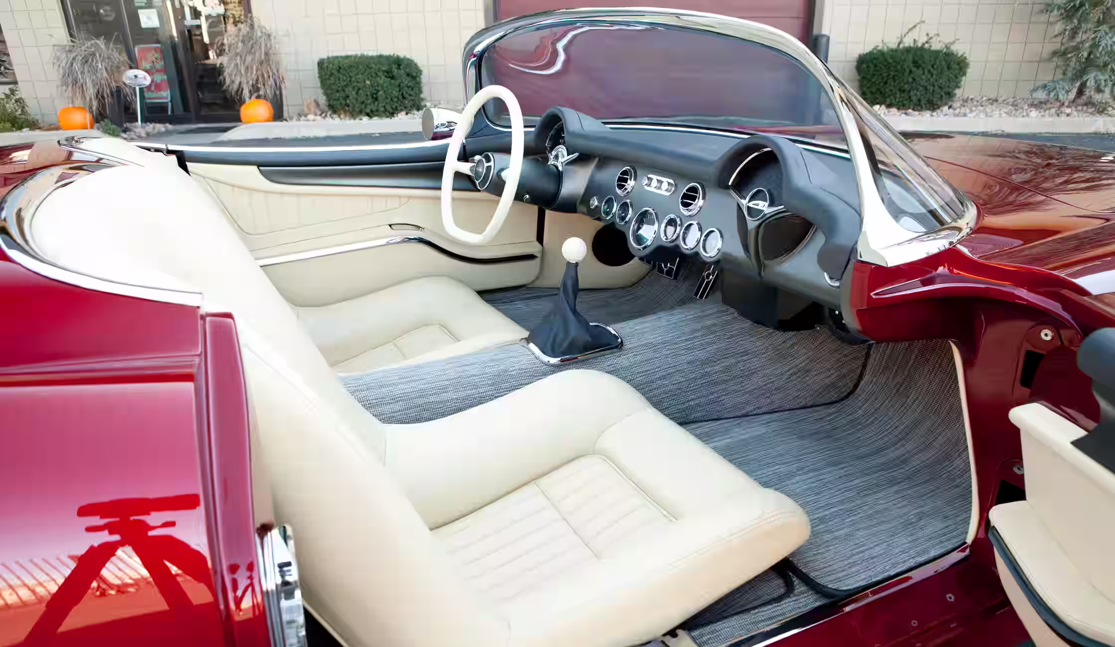 Leather interior in Color “Sand Cream” by JS Custom Interiors. Custom Door Panels Wrapped in leather. 3D Printed Glove Box. Full custom built seats. Sparc Industries Steering Wheel Designed by Dave built by Sparc. Dakota Digital Custom Built & Designed