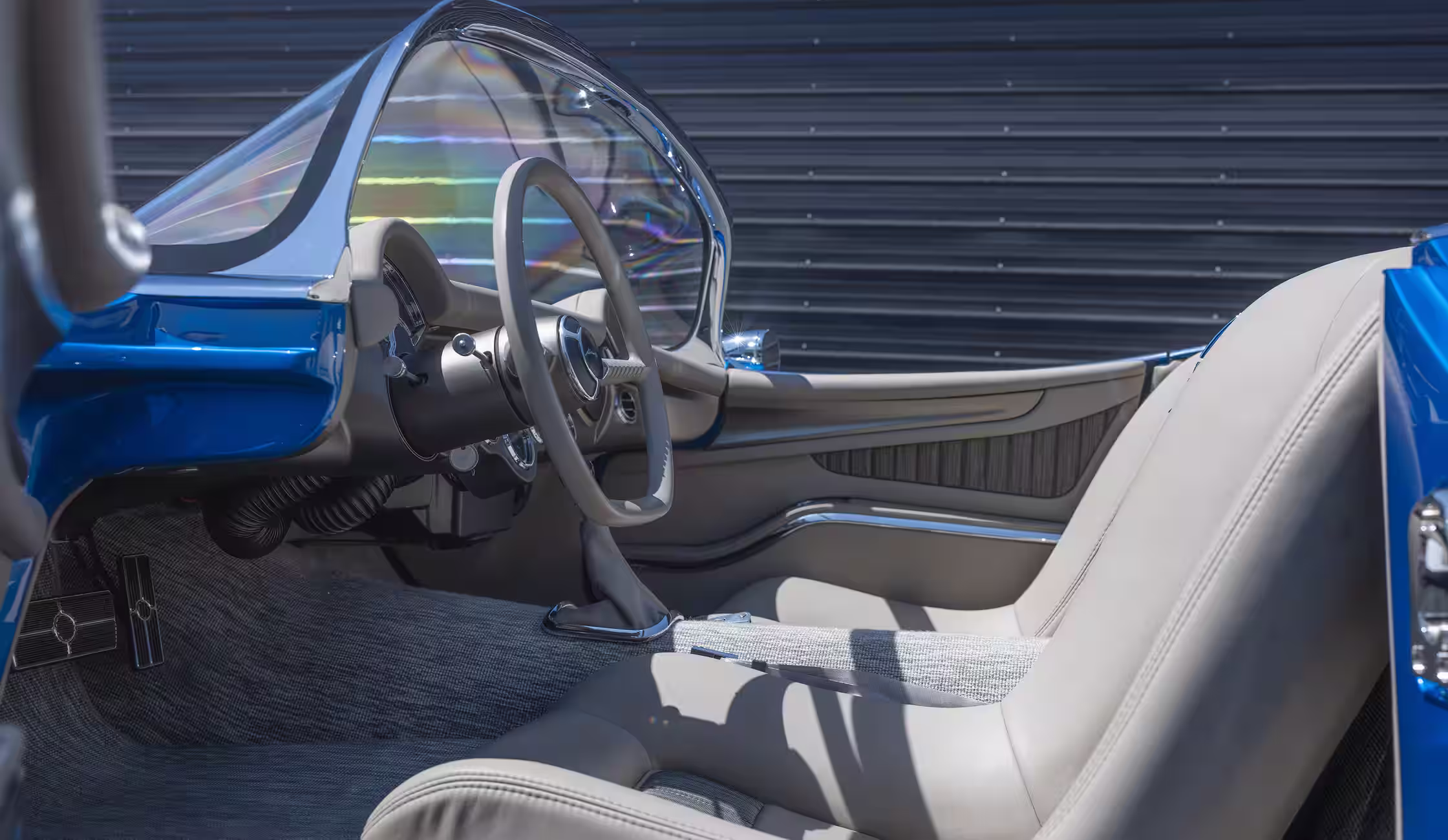 Leather interior in Color “Light Gray” with Alloy Chilewich by JS Custom Interiors. Custom Door Panels Wrapped in leather. 3D Printed Glove Box. Full custom built seats. Sparc Industries Steering Wheel Designed by Dave built by Sparc. Dakota Digital Custom Built & Designed
