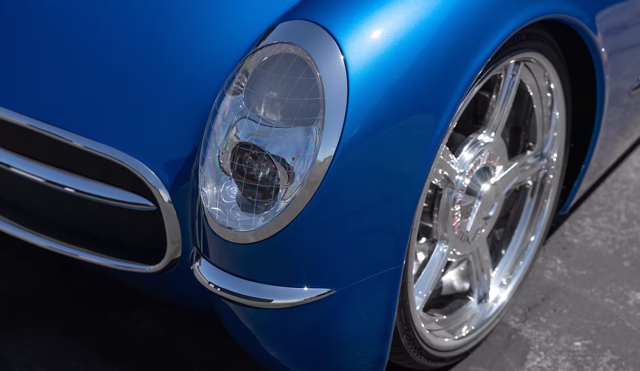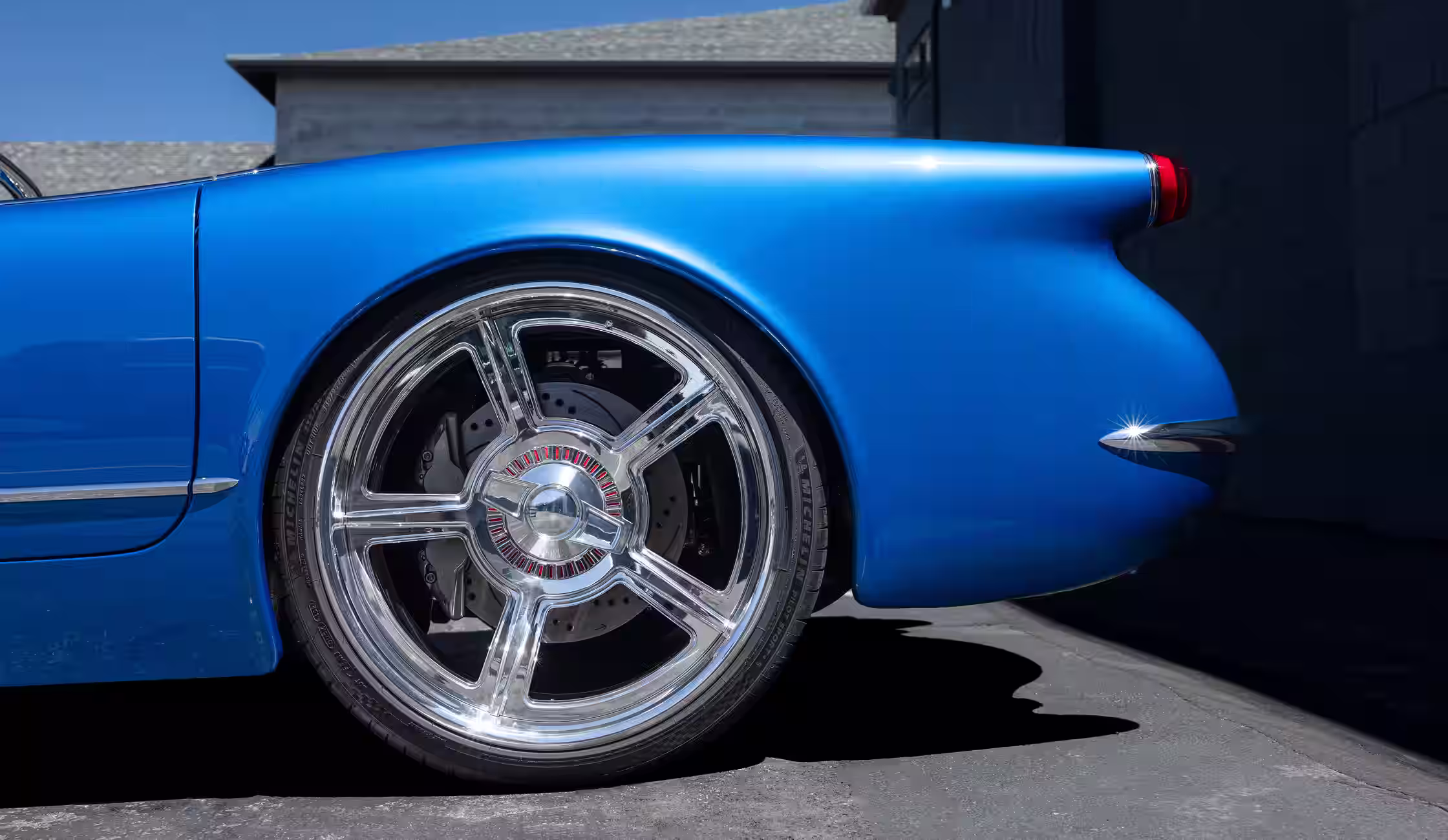 Wheels are “CF1 Ralley” 3-piece billet designed by Dave Kindig and built by Forgeline with a polished finish. Front 21x9 and Rear 22x12. Tires are Michelin Pilot 4S Front 255/30/21 and Rear 335/25/22.