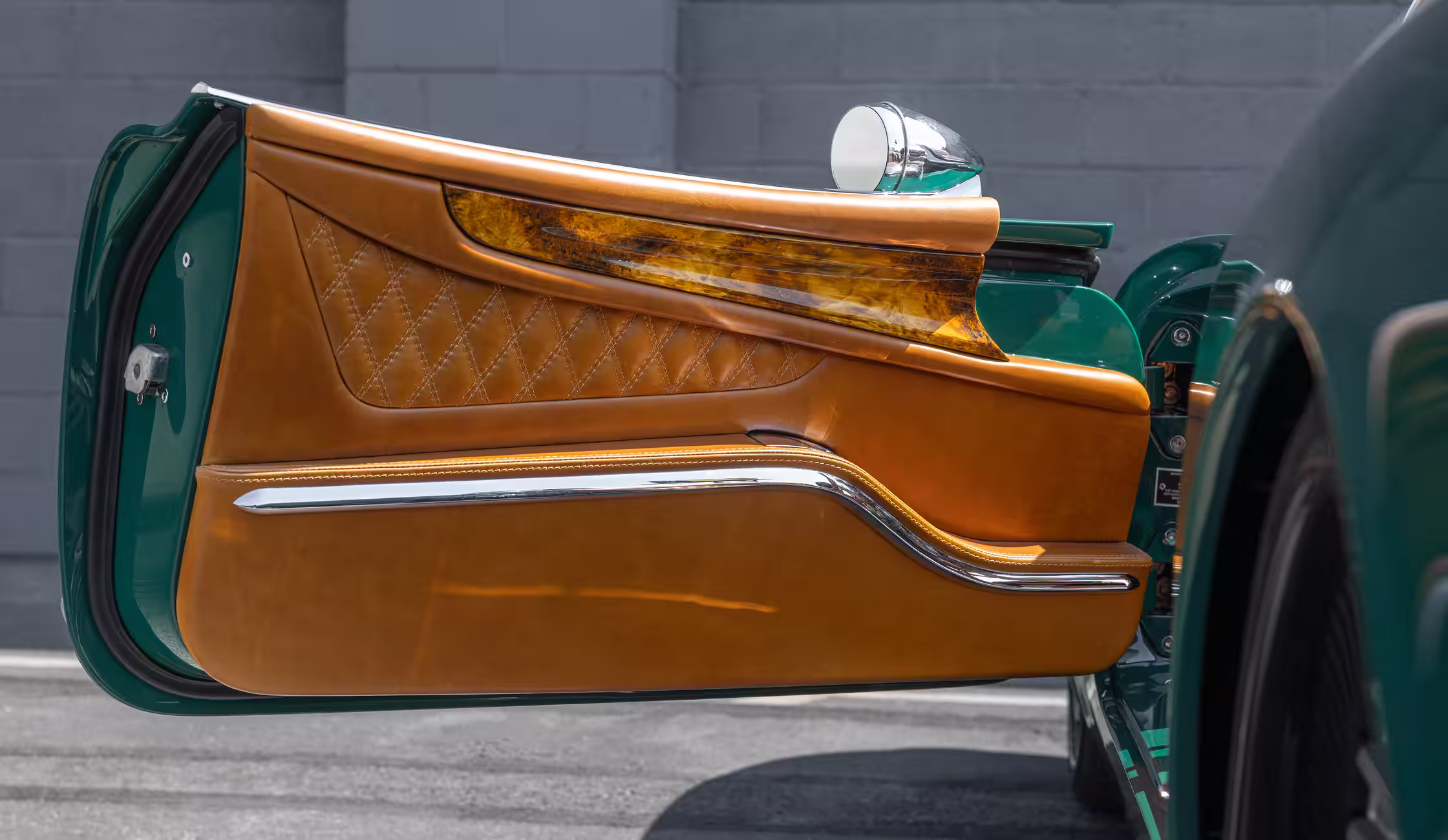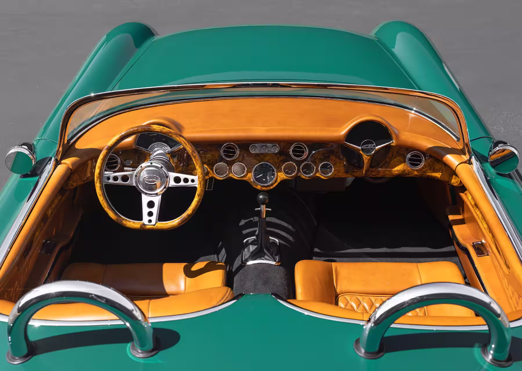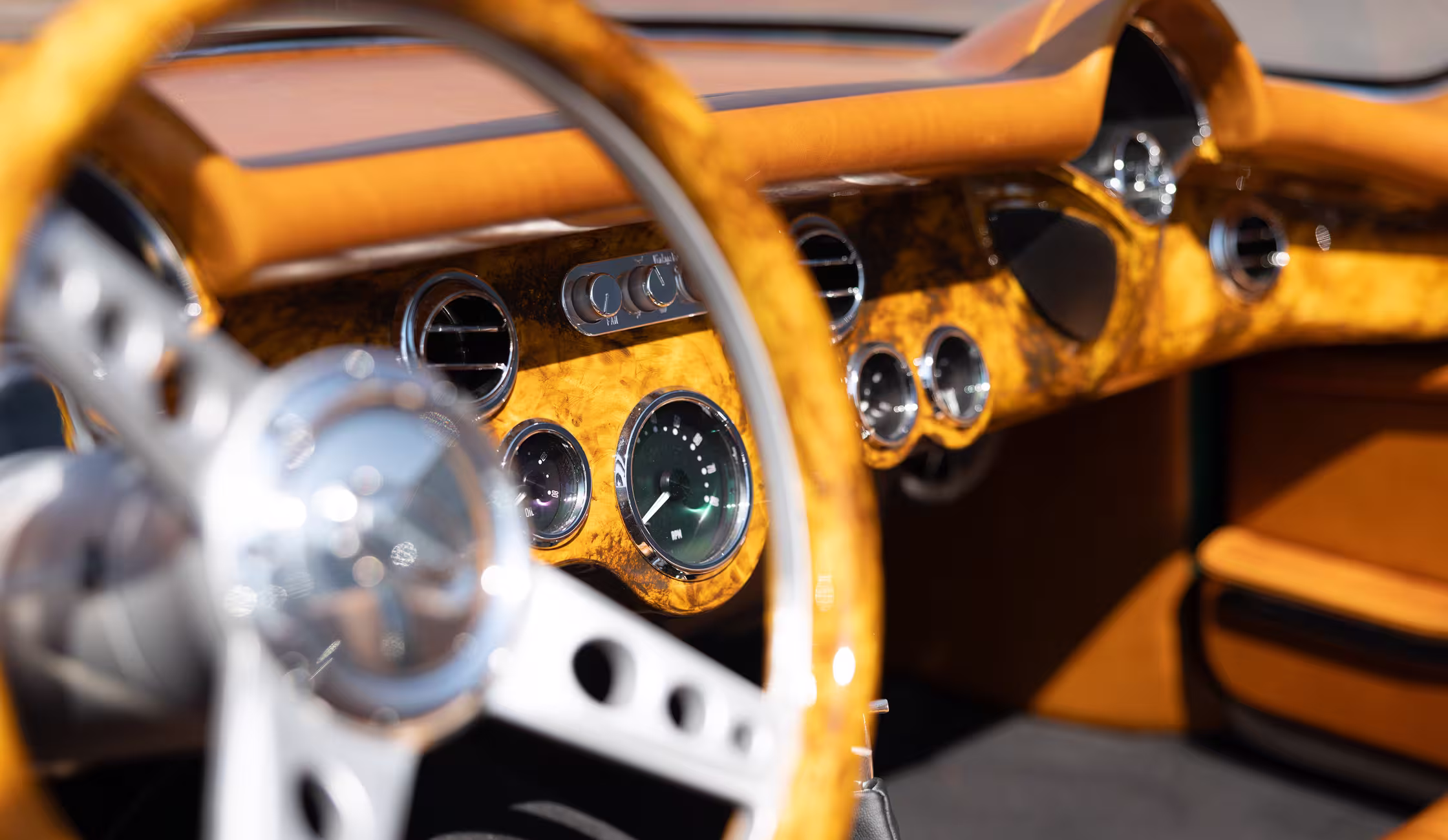 Leather interior in Color “Natural English Leather” by JS Custom Interiors. Custom Door Panels Wrapped in leather. 3D Printed Glove Box. Full custom built seats. Sparc Industries Steering Wheel Designed by Dave. Dakota Digital Custom Built & Designed. And handpainted woodgrain throughout the dash and door panels.