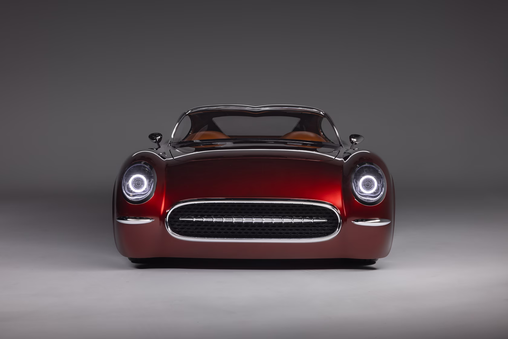 Paint is "Infrared" by Modern Classikk by AkzoNobel, accent color called "Sagebrushed". The body is a hand formed unibody made of 3003T0 and 6061 Aluminum, built completely from scratch loosely based on an early Corvette based concept for the "Corvair".